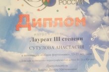 Сутулову Настю - лауреата 3 степени Всероссийского фестиваль-конкурса детского и юношеского творчества "Будущее России". (преподаватель Зимина Д.М.). Желаем дальнейших успехов!