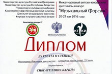 Лауреата 2 степени Международного детско-юношеского фестиваль-конкурса "Музыкальный форсаж" - Сибгатуллину Карину (преподаватель Самигуллина Л.И., хореограф Егорова М.И.). Желаем дальнейших успехов!