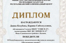 Победителей 2 Республиканского экологического фестиваля-конкурса "Радужная сцена" воспитанников нашей школы Козубову Даяну, Сибгатуллину Карину и хореографический коллектив "Сказка" (Рук. Самигуллина Л.И., Ямалеева А.Я., Солдатова Л.Г.). Желаем дальнейших успехов!
