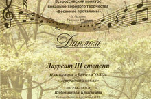 Поздравляем Лауреата 3 степени Всероссийского конкурса вокально-хорового творчества "Весенние проталины" Водоватову Кристину (рук. Ергакова В.Н.), хореографический коллектив "Созвездие "Детство"" (рук. Шарафутдинова Л.В.). желаем дальнейших успехов!