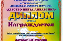 Поздравляем Сибгатуллину Карину (рук. Самигуллина Л.И.) и хореографический коллектив "Сказка" (рук. Солдатова Л.Г.) - лауреатов 3 степени Международного фестиваля-конкурса детского и юношеского творчества "Детство цвета апельсин". желаем дальнейших успехов!