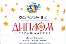 Лауреатов 2 степени Всероссийского межнационального конкурса-фестиваля музыкального и хореографического искусства "Возрождение" - Сибгатуллину Карину и хореографический коллектив "Сказка" (рук. Самигуллина Л.И., Солдатова Л.Г.). Желаем дальнейших успехов.