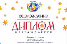 Лауреата 2 степени Всероссийского межнационального конкурса-фестиваля музыкального и хореографического искусства "Возрождение" - Козубову Даяну и хореографический коллектив "Ласточка" (рук. Самигуллина Л.И., Егорова М.И.). Желаем дальнейших успехов!