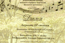 Лауреатов III степени Всероссийского конкурса вокально-хорового творчества "Весенние проталины" Вокальный дуэт "Сэйлен" Тукфатуллину Эльвиру, Гарипову Айгуль (рук. Ергакова В.Н.), вокал -соло Ахметзянову Ясмину (рук. Самигуллина Л.И., хореограф Солдатова Л.Г.), который прошел 18 апреля 2015г. в Казанском государственном университете культуры и искусств.