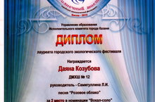 Лауреата городского экологического фестиваля "Солнечный мост" Козубову Даяну (преп. Самигуллина Лариса Ивановна) со 2 местом в номинации "Вокал-соло".