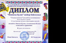 Поздравляем участников городского конкурса "Кояшлы бүләк" вокальный дуэт (Каюмова Булата и Ахметзянову Ясмину) и ансамбль кураистов (руководители: Самигуллина Л.И., Коковкина Т.Б., Ямалеева А.Я.) - ДИПЛОМАНТОВ II СТЕПЕНИ.
