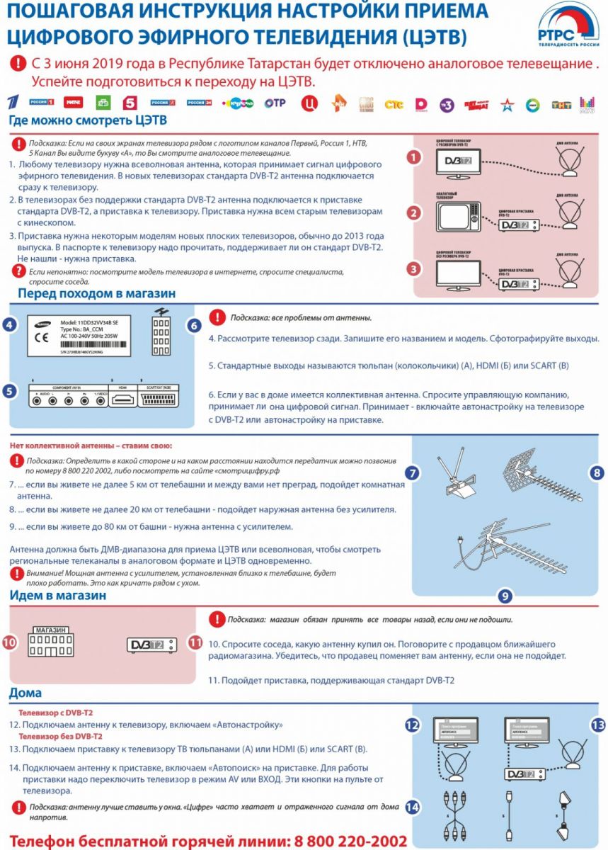 4 октября 2019 года в Республике Татарстан предстоит полномасштабный переход на цифровое телевещание, в рамках которого будет отключено аналоговое эфирное телевещание. Всвязи с эти предлагаем вам ознакомиться с инструкцией.