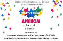 Поздравляем коллектив многоплановой хореографии "Йолдыз" и их руководителя Гизатуллину Лилию Рашидовну с Дипломом Лауреата 2 степени Всероссийского многожанрового конкурс-фестиваля детского и юношеского творчества "Энергия звезд"!