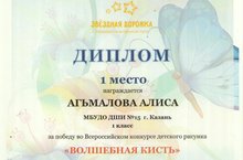 Поздравляем Агъмалову Алису - учащуюся отделения изобразительного искусства ДШИ №15 (преподаватель Егоров К.Г.) с победой во Всероссийском конкурсе детского рисунка "Волшебная кисть"