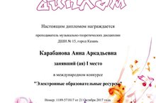 Поздравляем Карабанову Анну Аркадьевну - преподавателя теоретических дисциплин и фортепиано с победой в Международном конкурсе "Электронные образовательные ресурсы
