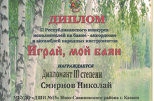 Поздравляем Смирнова Николая, учащегося ДШИ №15 (преподаватель Настаушев А.М.), с Дипломом III степени II Республиканского конкурса исполнителей на баяне-аккордеоне и ансамблей народных инструментов.
