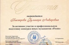 Благодарность Быстровой Гульнаре Анваровне, преподавателю ДШИ №15, за активное участие и профессиональную подготовку городского конкурса юных музыкантов "Presto"