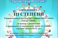 Поздравляем танцевальный коллектив "Next time" (руководитель Мясарова Ольга Александровна) с победой в Международном конкурсе-фестивале детских и юношеских хореографических колективов "Здравствуй, Россия!"