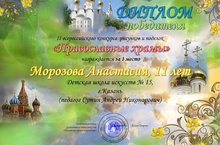Поздравляем Морозову Анастасию, учащуюся ДШИ №15 (преподаватель Сутин А.Н.) с Дипломом победителя (1 место) во II Всероссийском конкурсе рисунков и поделок "Правословные храмы".
