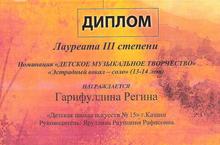 Поздравляем Гарифуллину Регину с получением диплома лауреата III степни в V Международном молодежном музыкальном фестивале-конкурсе эстрадных и джазовых исполнителей "Огни Казани"!