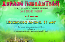 Поздравляем Шакирову Диану, ученицу отделения изобразительного искусства ДШИ №15 (преподаватель Сутин А.Н.), занявшую II место в Международном конкурсе рисунков "Моя малая Родина".