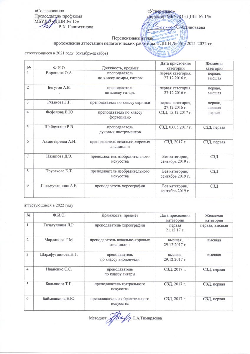 Перспективный план прохождения аттестации педагогических работников ДШИ №15 в 2021-2022 уч. году