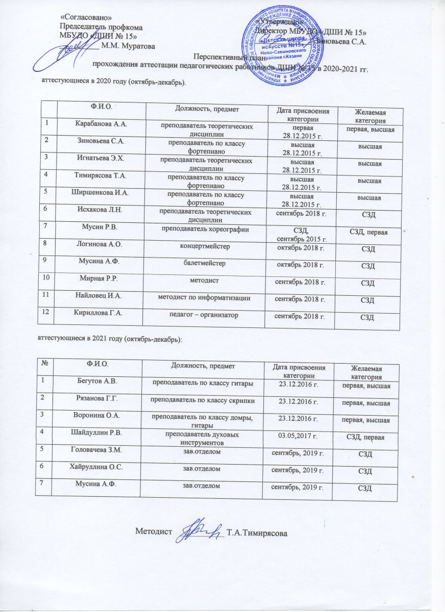 Перспективный план прохождения аттестации педагогических работников ДШИ №15 на 2020-2021 учебный год