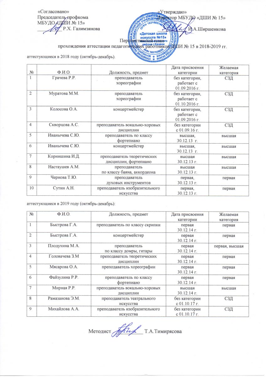 Перспективный план прохождения аттестации педагогических работников ДШИ №15 в 2018-2019 гг.