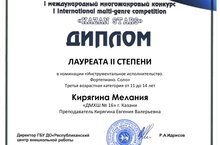 Поздравляем Кирягину Меланию (фортепиано) с успешным выступлением в I Международном многожанровом конкурсе "KAZAN STARS". Лауреат II степени. Класс преподавателя Кирягиной Евгении Валерьевны. Кирягин Лев - Дипломант 1 степени. Класс преподавателя Зайнуллина Романа Валерьевича. Молодцы!