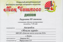 Ансамбль "Монлы курай" стал лауреатом 3 степени Открытого республиканского фестиваля-конкурса татарского искусства «Мон чишмэсе», который прошел 25 марта в городе Набережные Челны. Руководитель Диярова Ф.Г., концертмейстер Фархуллина С.Р. Поздравляем юных кураистов и их преподавателей и желаем дальнейших успехов!
