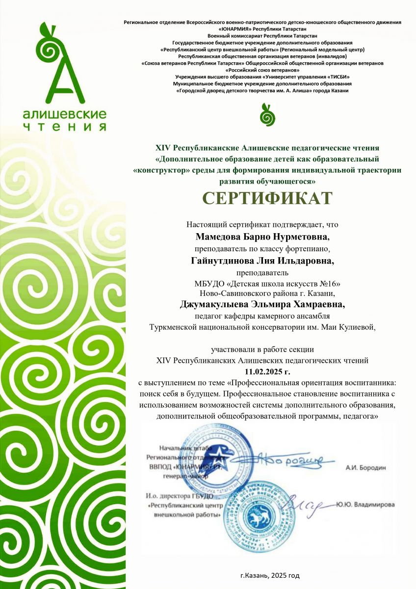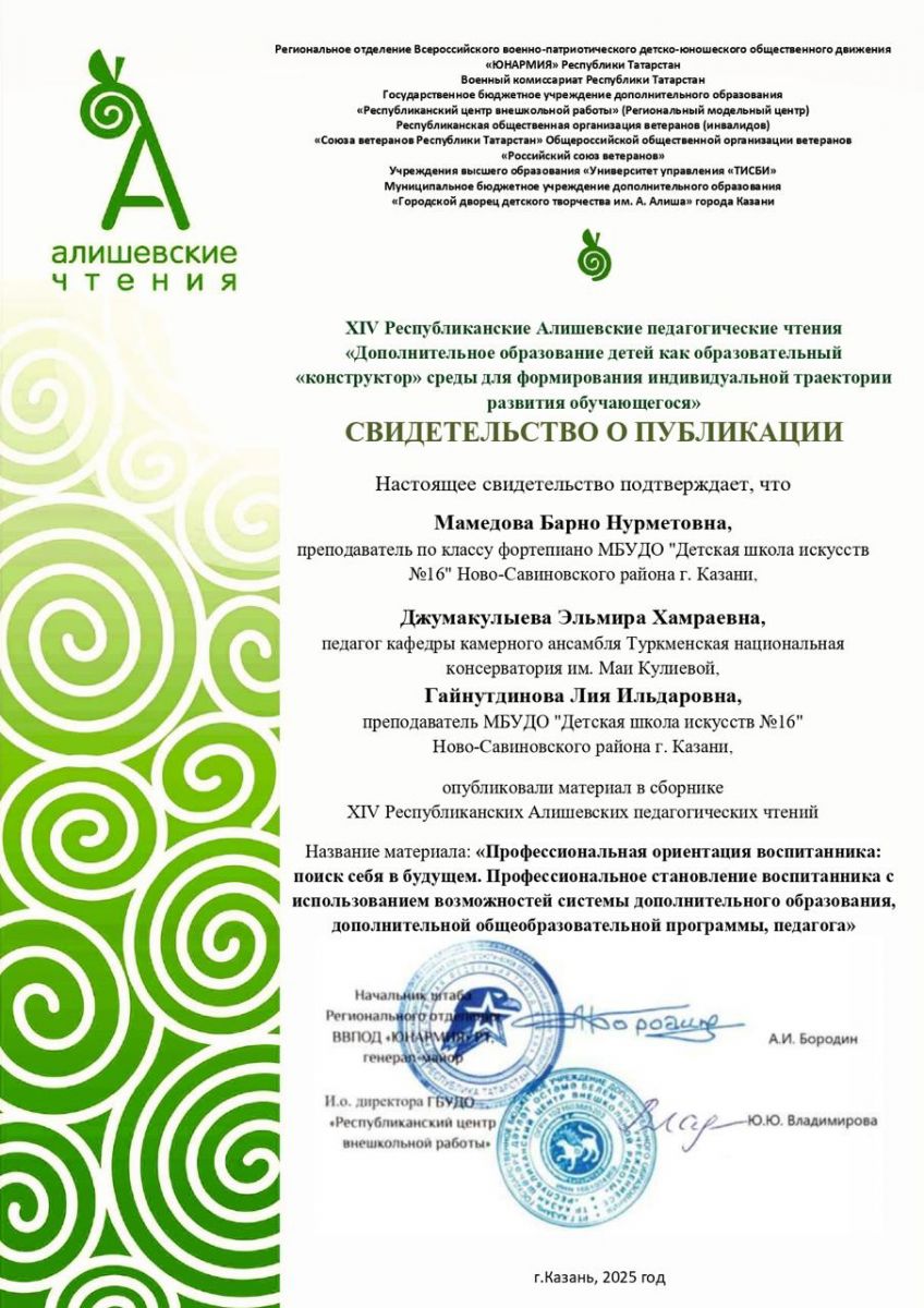 3. Мамедова Б.Н., Гайнутдинова Л.И. Свидетельство о публикации материала в сборнике Алишевских чтений