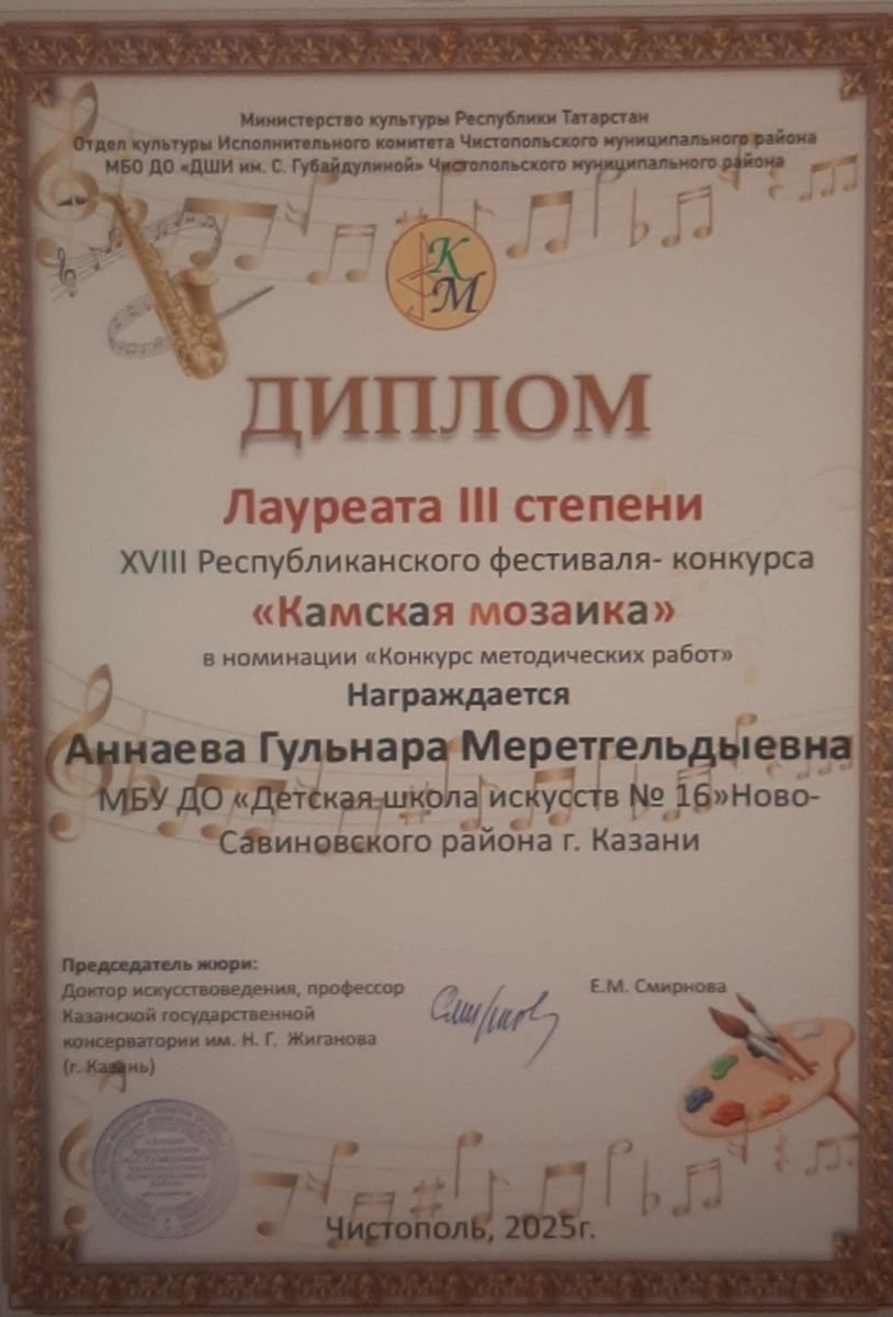 13. Аннаева Г.М. Лауреат 3 степени. Республиканский фестиваль-конкурс "Камская мозаика"
