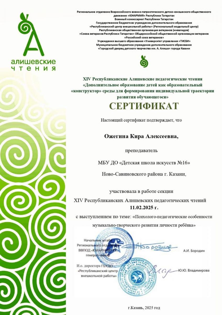 7. Ожегина К.А. XIV Республиканские Алишевские педагогические чтения. Сертификат (выступление)