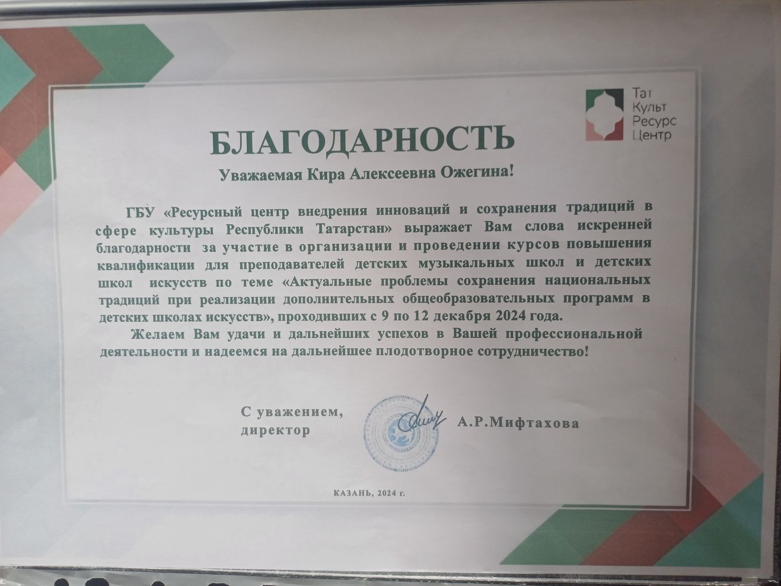 9. Ожегина К.А. Благодарность за участие в организации и проведении КПК