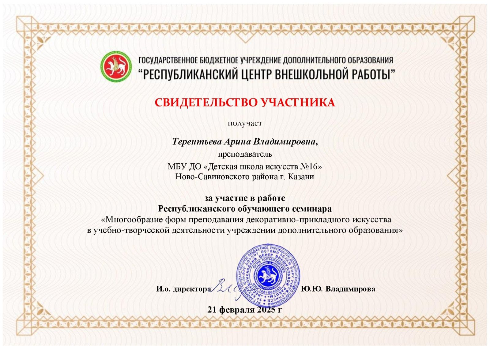 3. Терентьева А.В. Республиканский практический семинар «Освоение современных худож.приемов графики в реализации творческого потенциала учащихся». Выступление по теме «Патриотическое воспитание на уроках композиции в доп.оразовании художественной направленности с использованием графических средств», свидетельство участника
