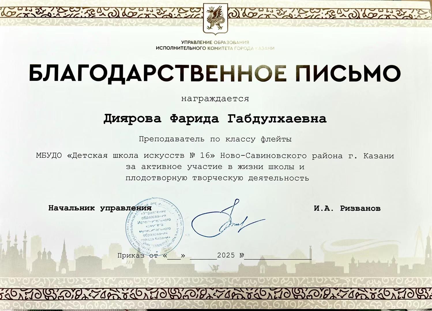 44. Диярова Ф.Г. Благодарственное письмо "За добросовестный труд, значительный вклад в развитие школы"