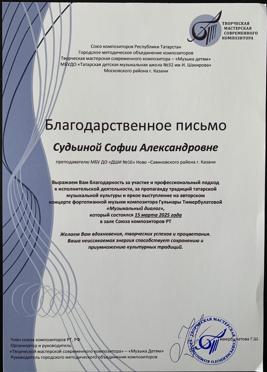 22. Судьина С.А. Благодарственное письмо. Авторский концерт фортепианной музыки.Г.Тимербулатовой