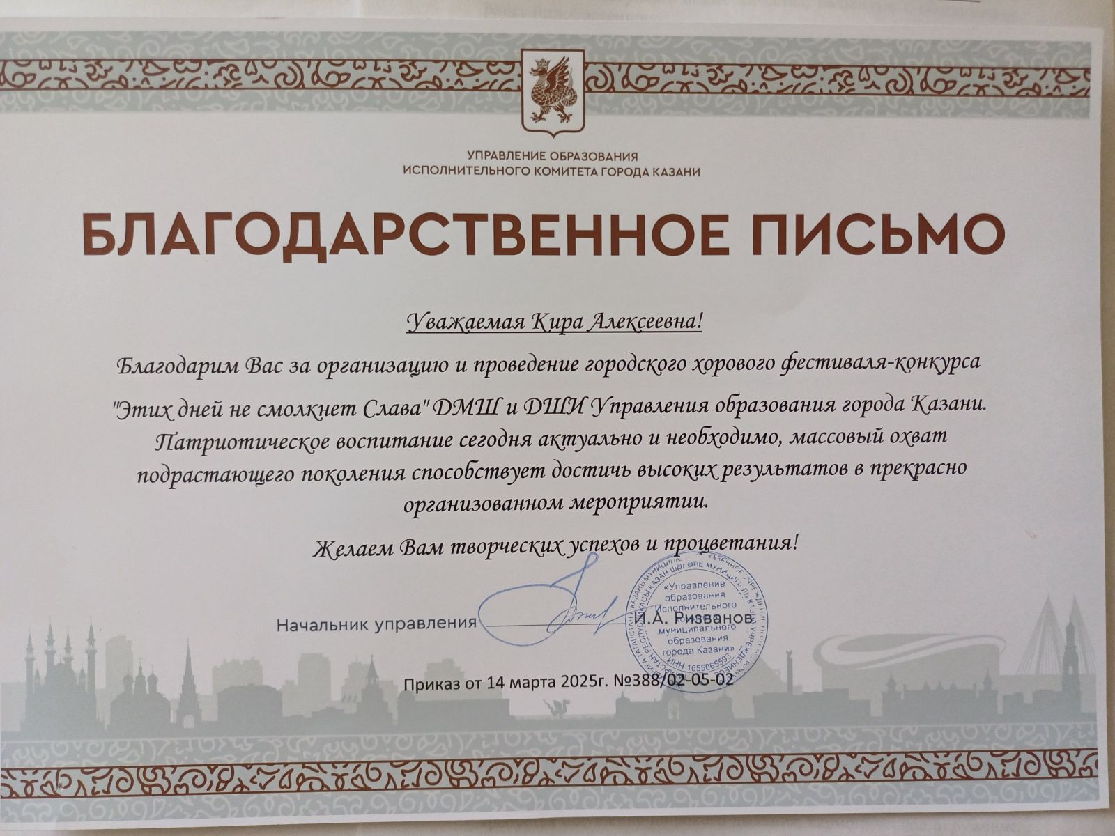 41. Донскова Л.В. Благодарственное письмо. Городской хоровой фестиваль-конкурс "Этих дней не смолкнет Слава"