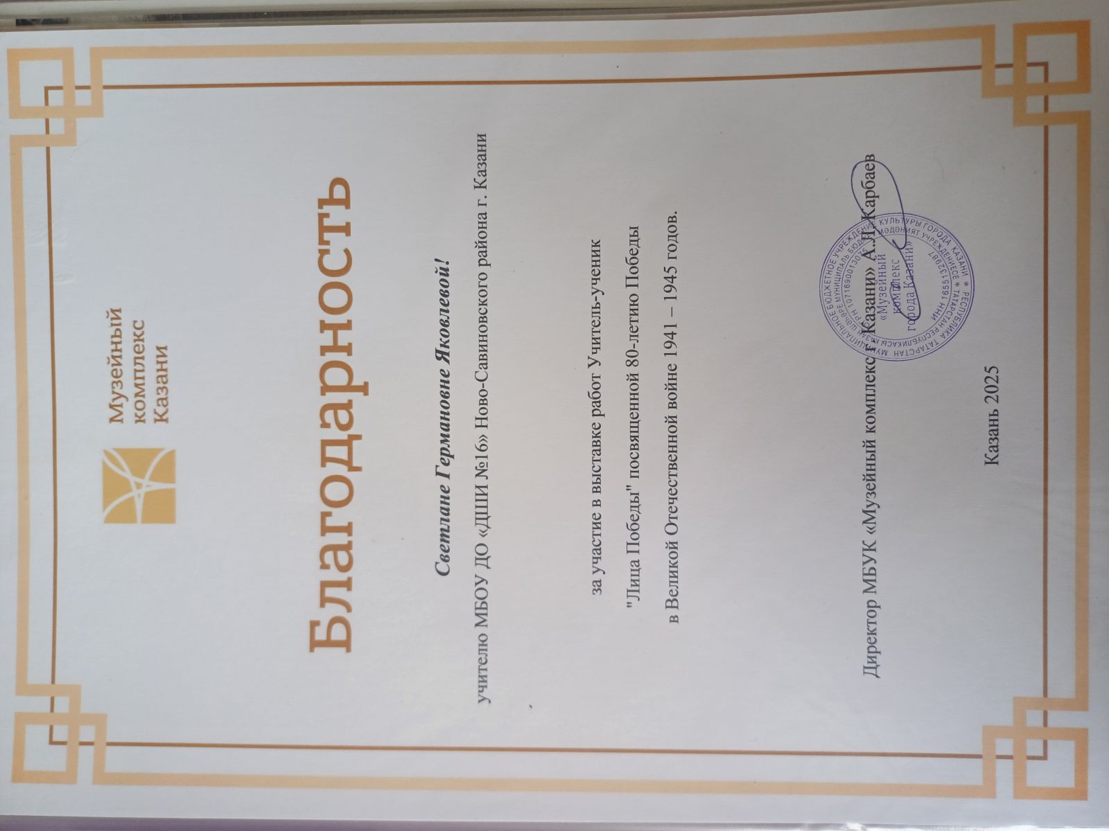 34. Яковлева С.Г. Благодарность за участие в выставке работ Учитель-ученик "Лица Победы"