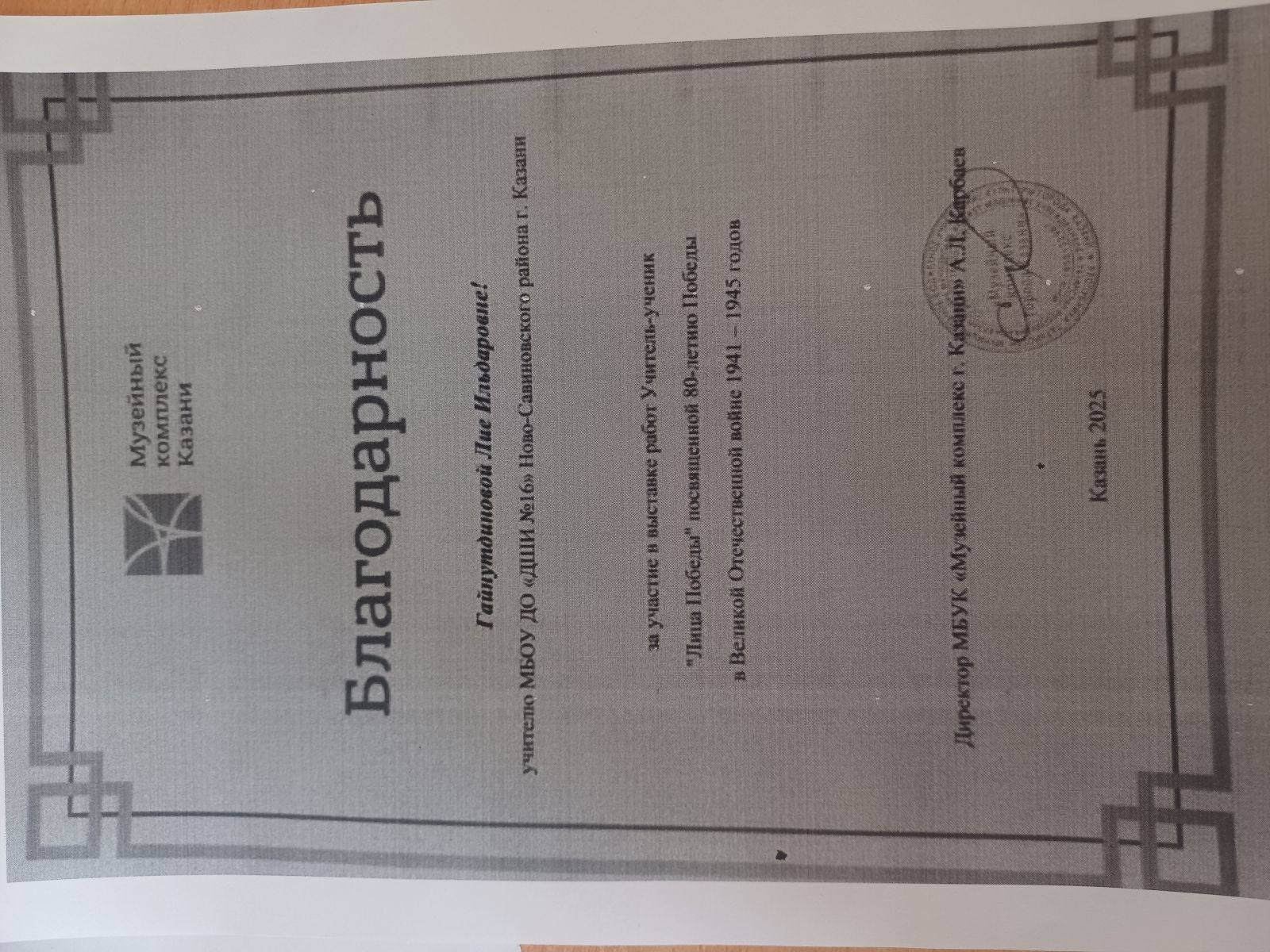 36. Гайнутдинова Л.И. Благодарность за участие в выставке работ Учитель-ученик "Лица Победы"