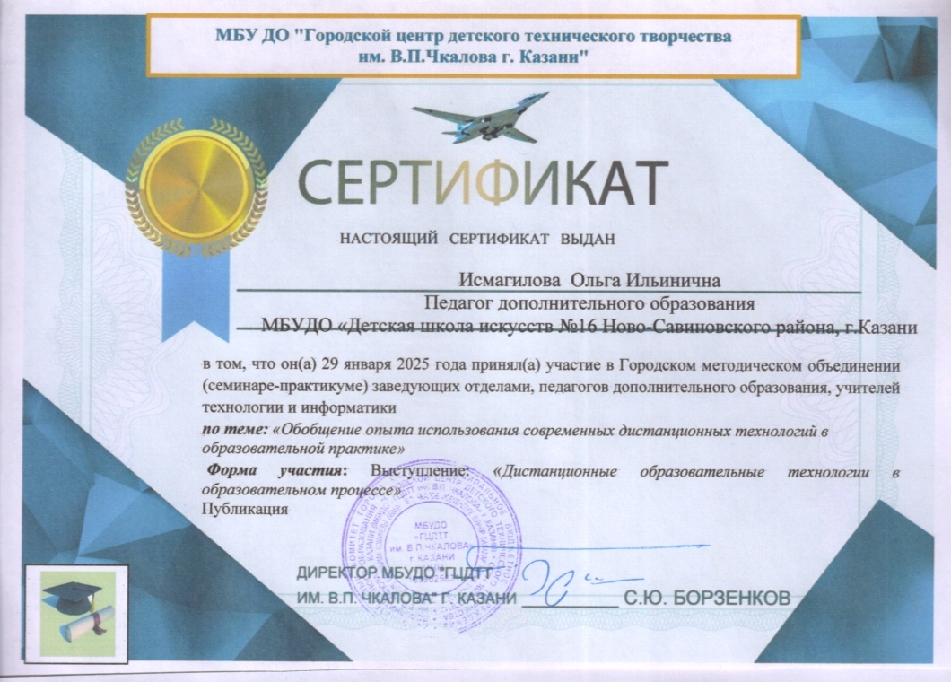 5. Исмагилова О.И. Выступление на ГМО на тему "Дистанционные образовательные технологии в образовательном процессе". Сертификат