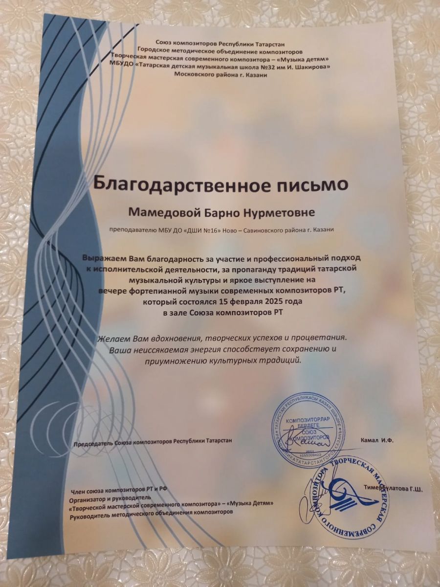 21. Мамедова Б.Н. Благодарственное письмо. Авторский концерт фортепианной музыки.Г.Тимербулатовой