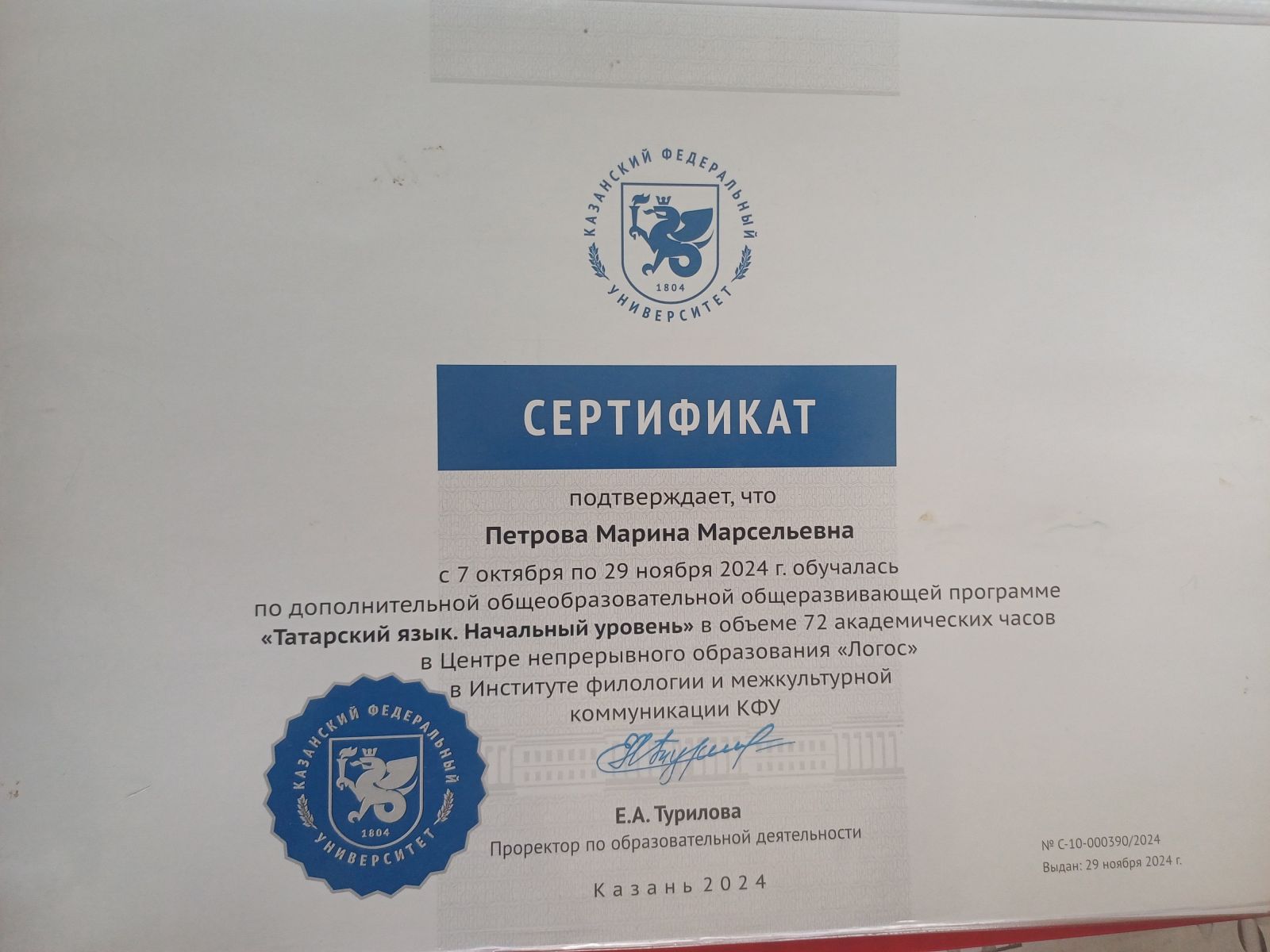 14. Петрова М.М. Обучение по ДООП "Татарский язык. Начальный уровень". Сертификат