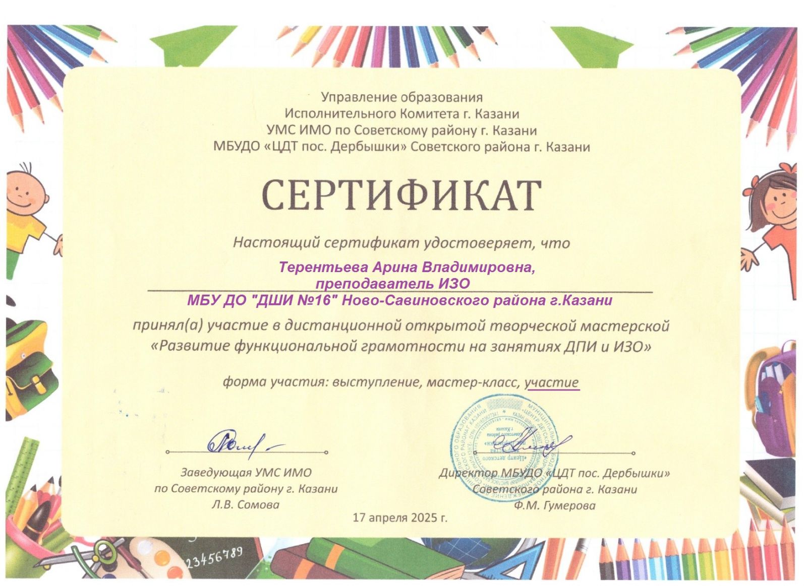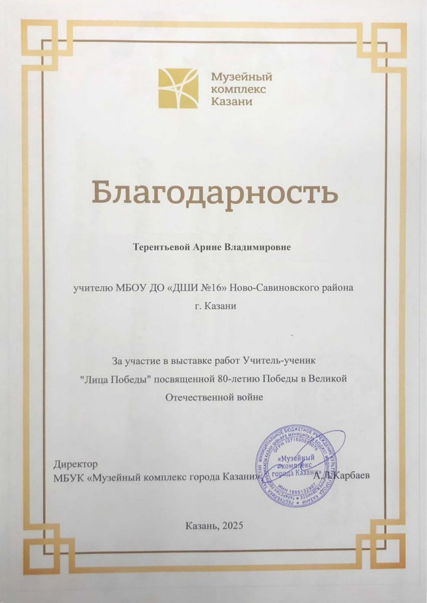27. Терентьева А.В. Благодарность. Выставка работ Учитель-ученик «Лица Победы», посвященная 80-летию Победы в ВОв