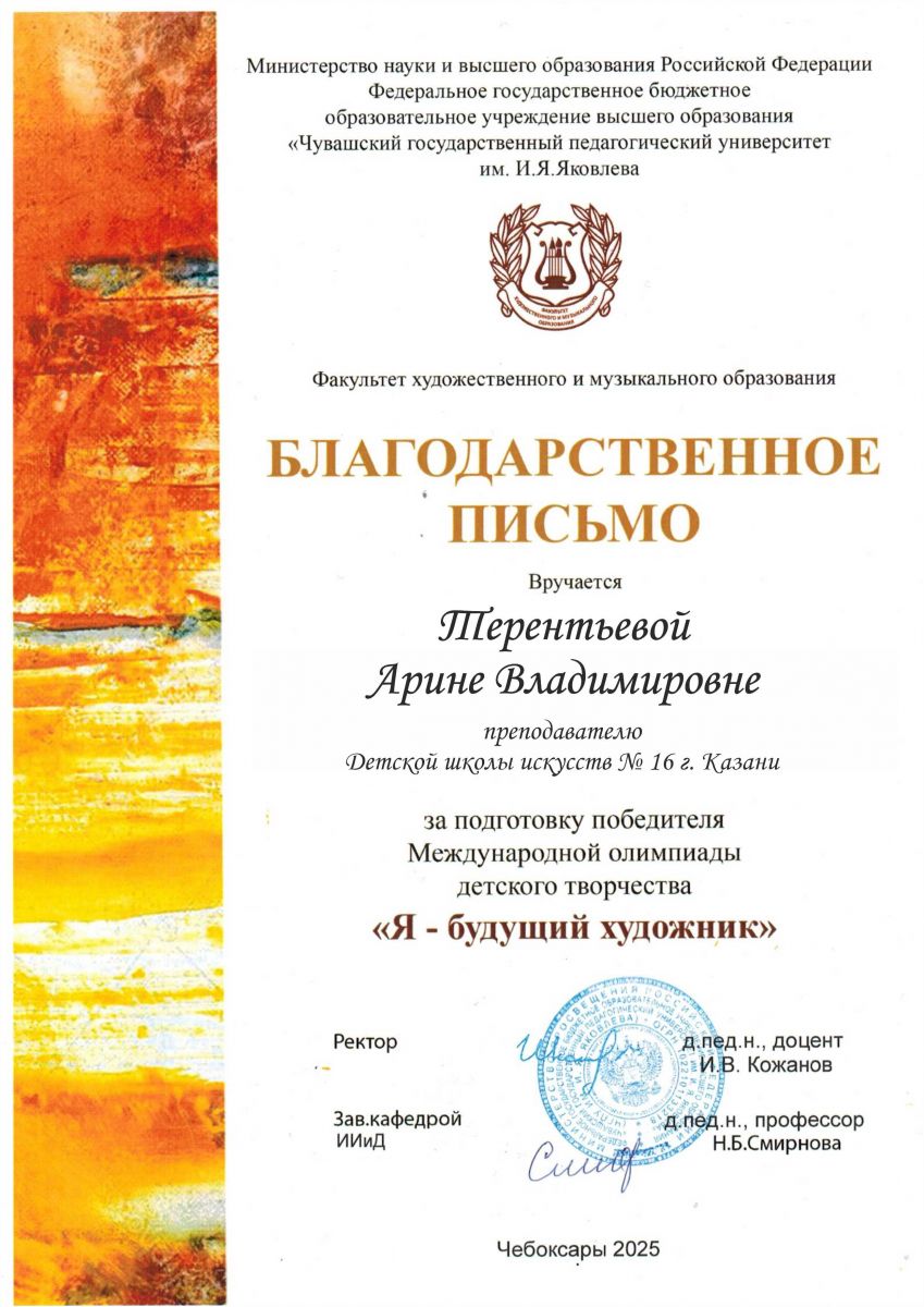 19. Терентьева А.В. Благодарственное письмо за подготовку победителя Международной олимпиады детского творчества "Я - будущий художник"