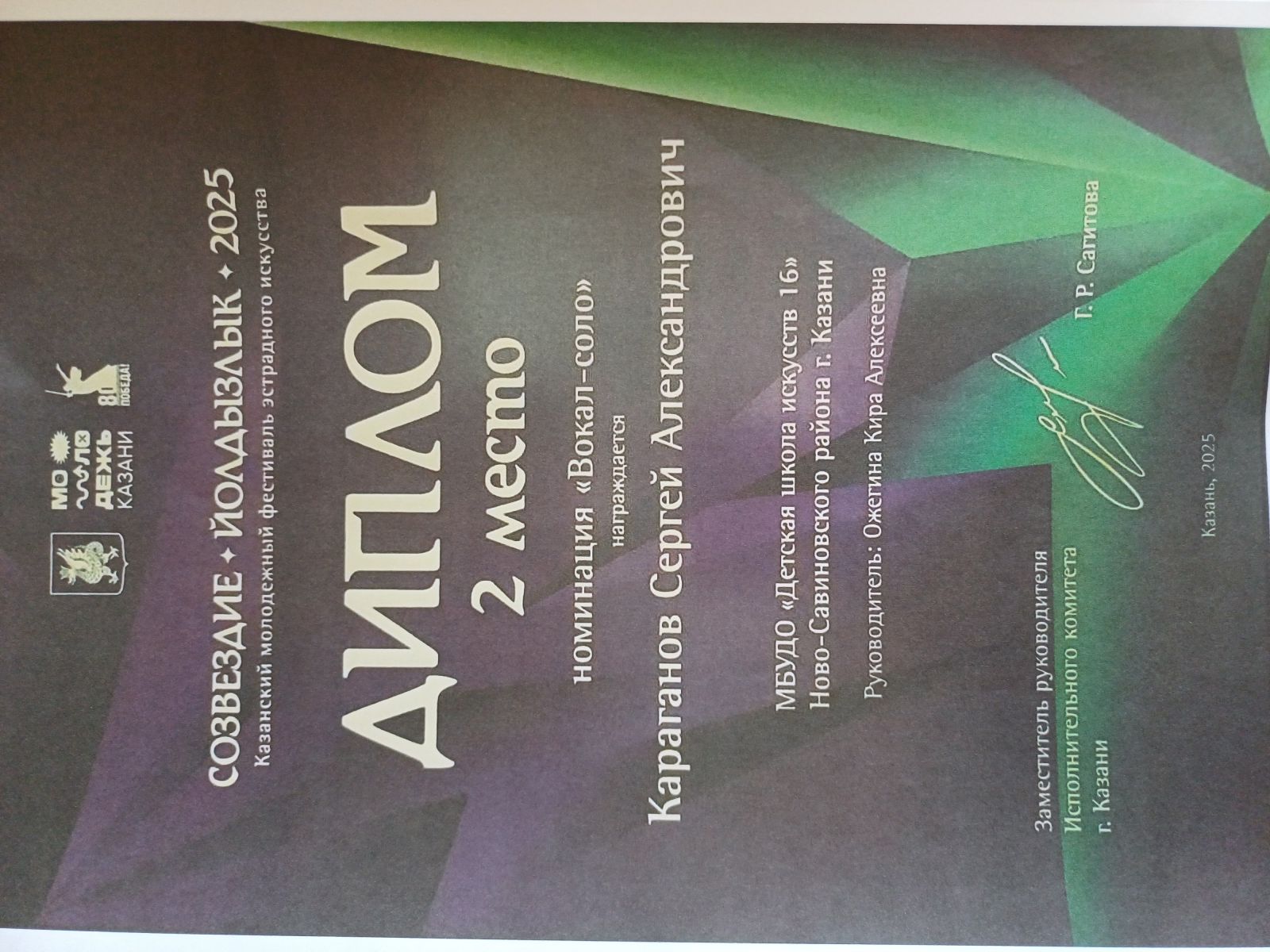 1. Караганов Сергей - диплом "Лучший солист" городского конкурса "Этих дней не смолкнет Слава"