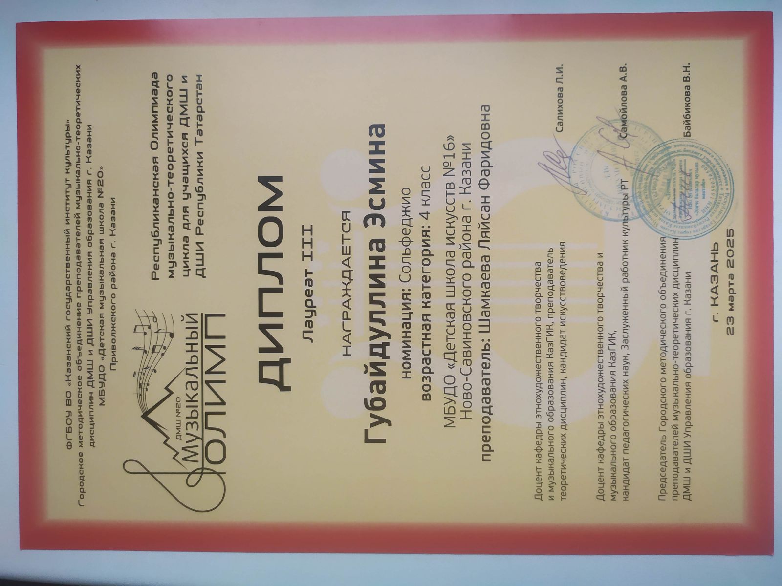 49. Губайдуллина Эсмина - лауреат 3 степени. Республиканская олимпиада «Музыкальный олимп»