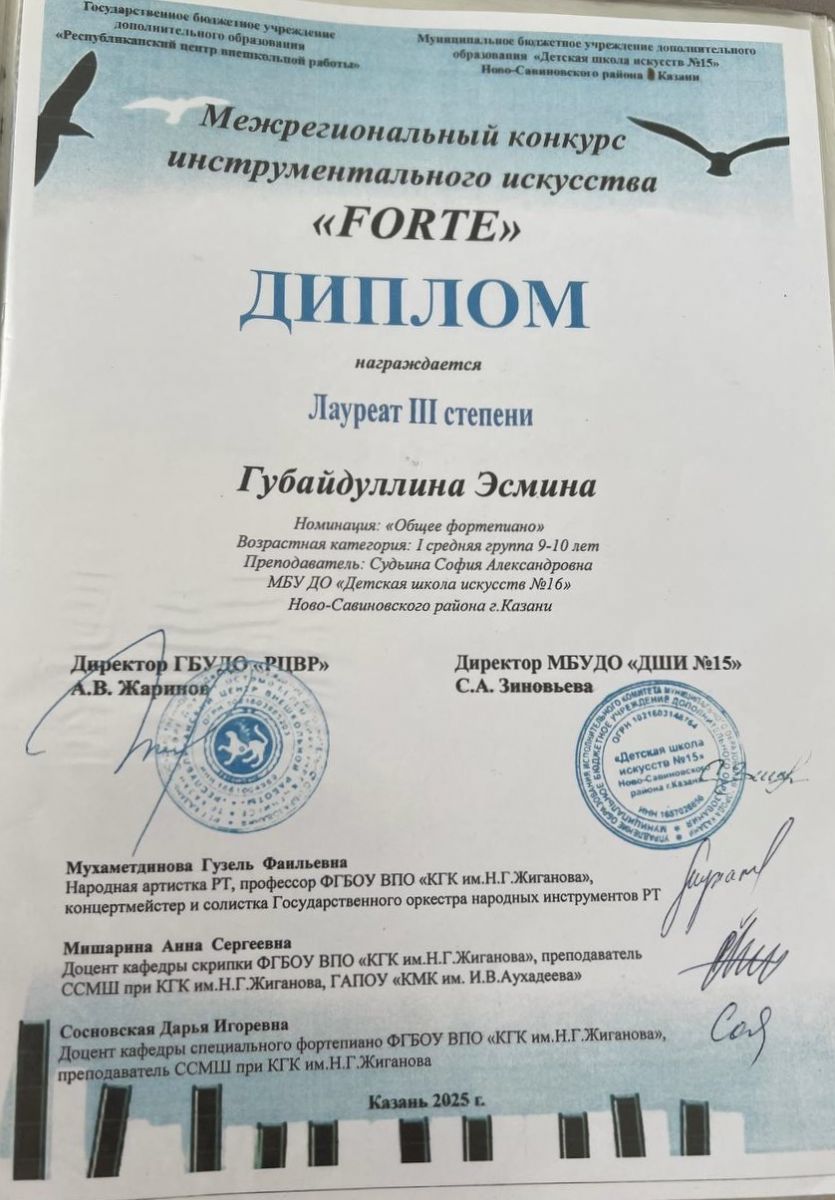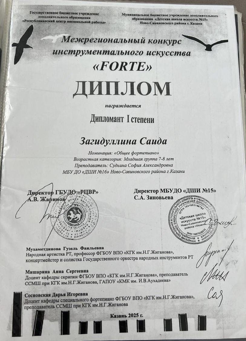 8. Загидуллина Саида - дипломант 1 степени. Межрегиональный конкурс инструментального искусства «FORTE»
