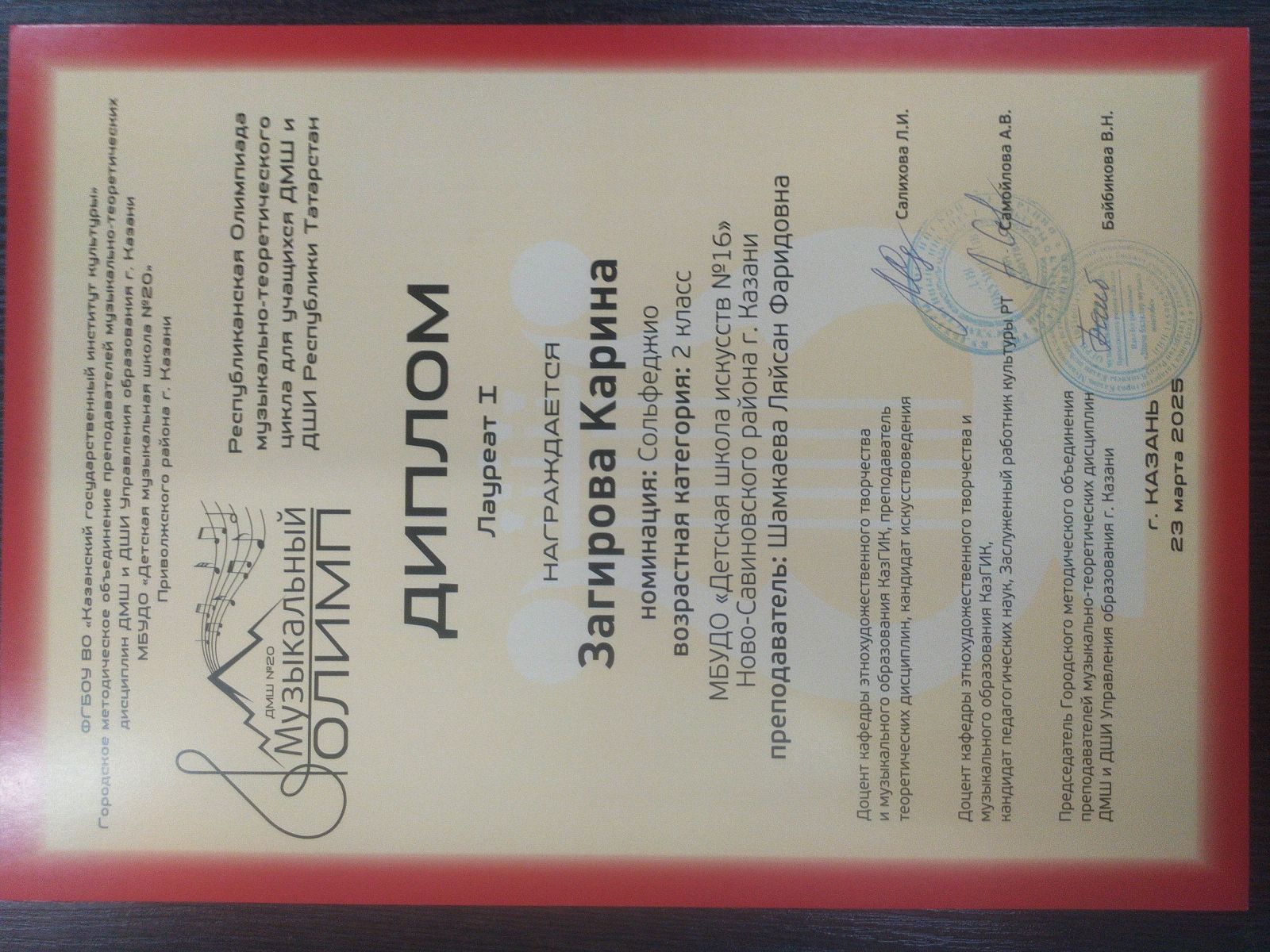 41. Загирова Карина - лауреат 1 степени. Республиканская олимпиада «Музыкальный олимп»