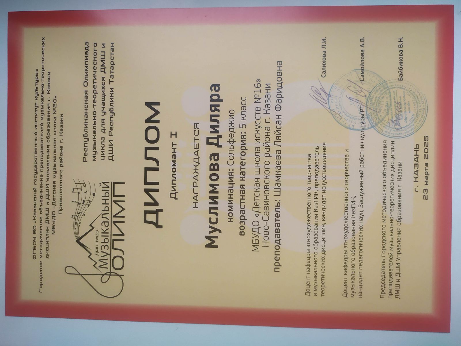 5. Шайдуллина Зарина - диплом 1 степени. Республиканская олимпиада «Музыкальный олимп»