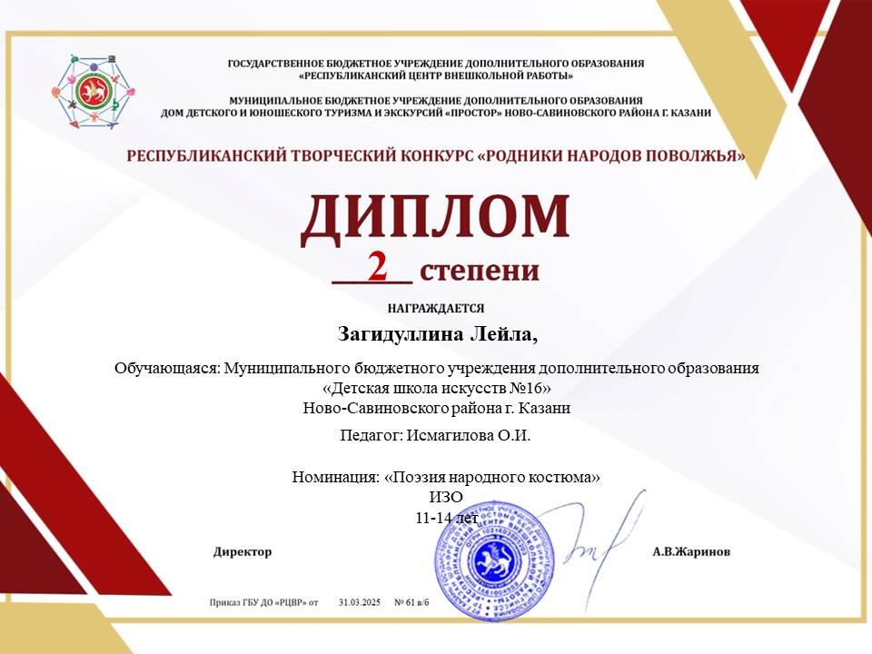 31.Чапаева Анна. Диплом 1 степени. Республиканский творческий конкурс «Родники народов Поволжья»