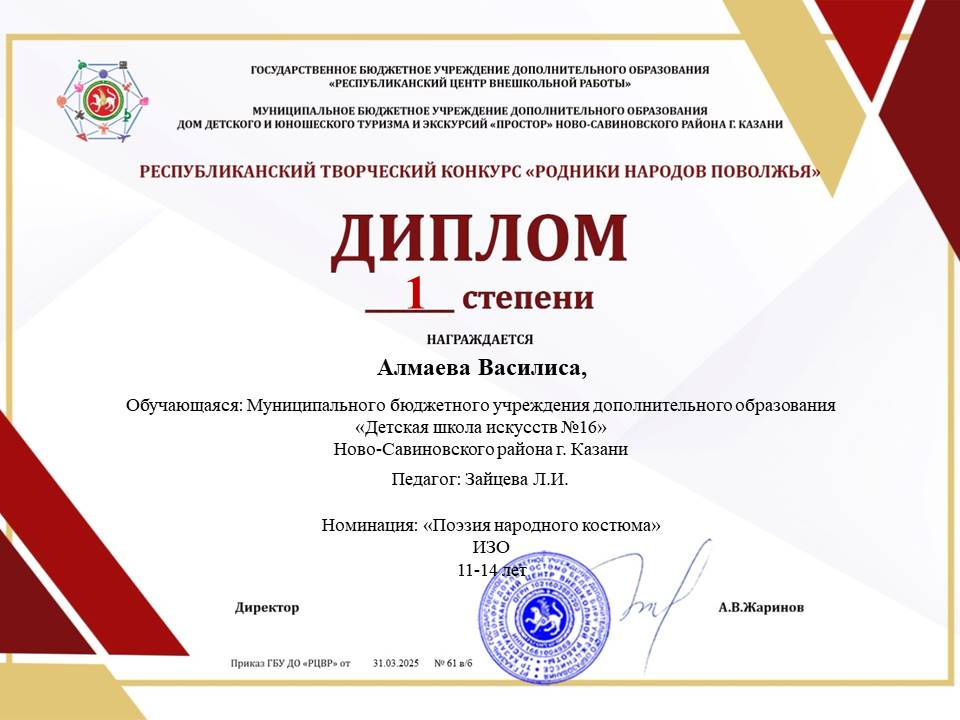 28. Алмаева Василиса. Диплом 1 степени. Республиканский творческий конкурс «Родники народов Поволжья»
