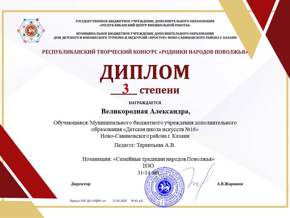 32. Великородная Александра. Диплом 3 степени. Республиканский творческий конкурс «Родники народов Поволжья»