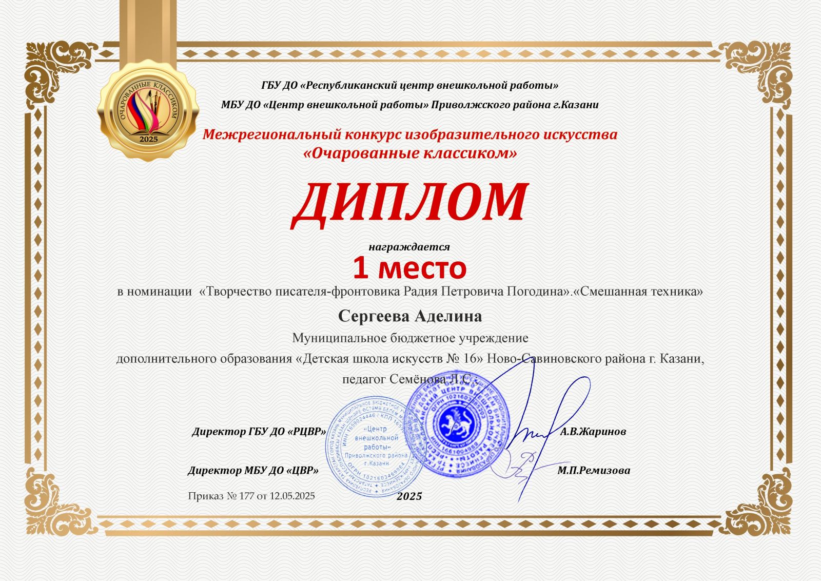 64. Сергеева Аделина - Диплом. 1 место. Межрегиональный конкурс изобразительного искусства «Очарованные классиком»
