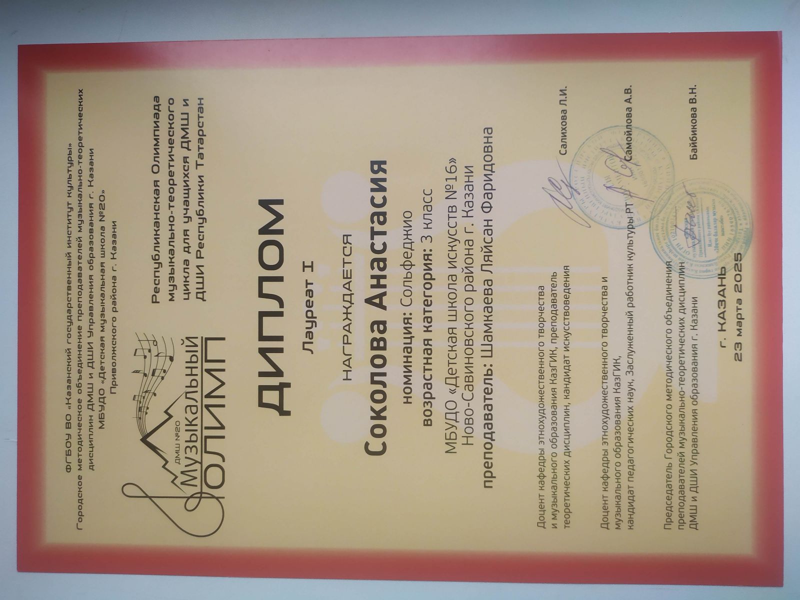 44. Соколова Анастасия - лауреат 1 степени. Республиканская олимпиада «Музыкальный олимп»